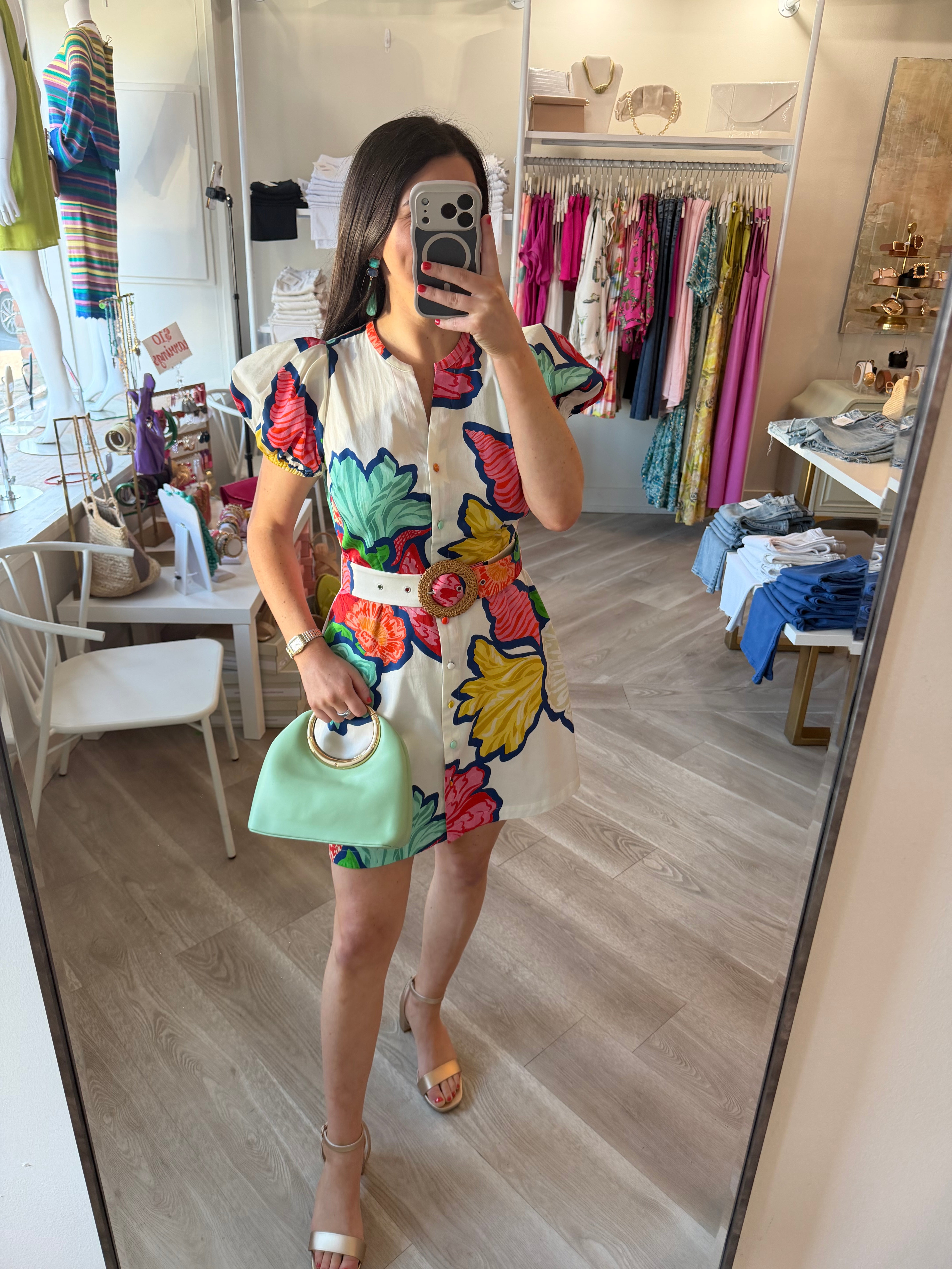 The Blakely Dress is exactly what your spring wardrobe is missing! In our new Dreamscape print, the Blakely offers a cinched waist with a matching belt, button front and puff sleeves--perfect for brunch or your next event!