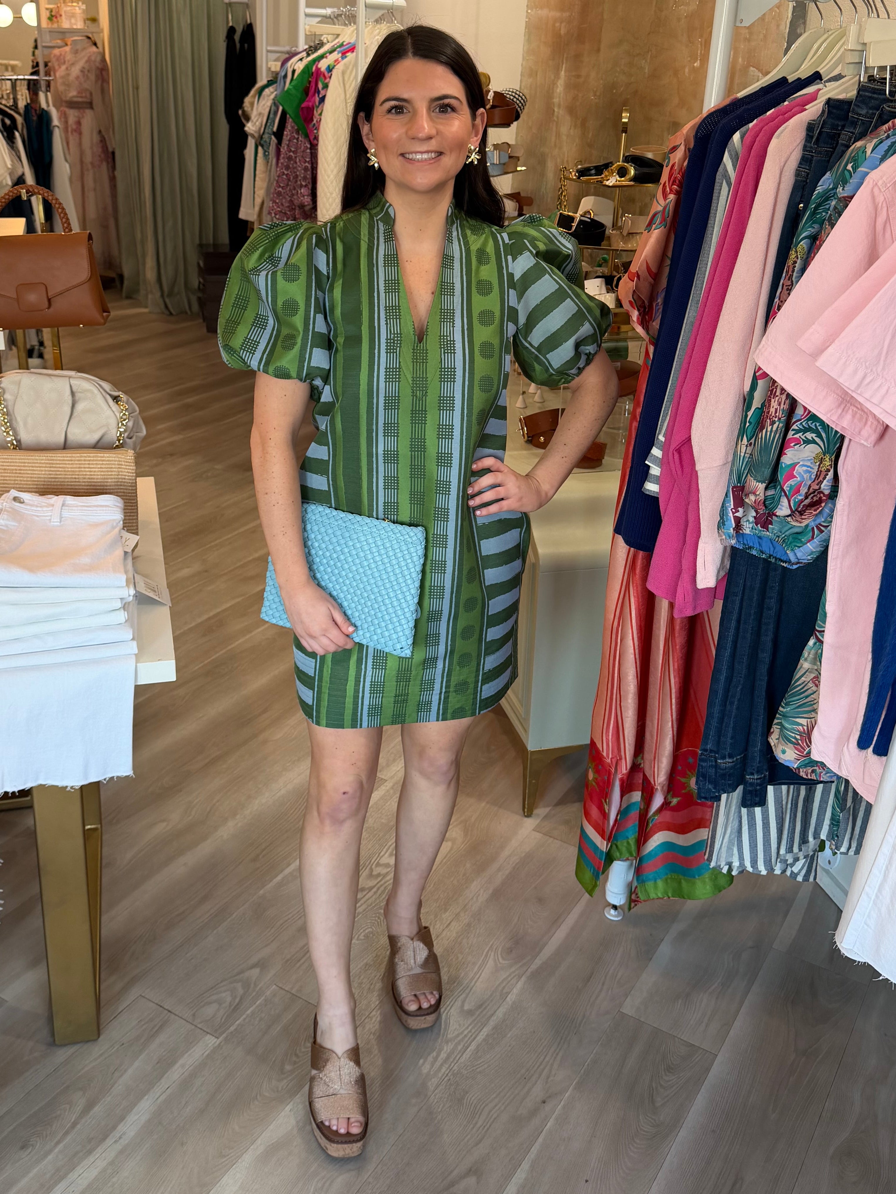 Hampton Mini in Forest Jubilee is an effortless statement with refined detail. Designed with a mandarin-style collar, puff sleeves, and functional side pockets, this silhouette feels relaxed yet thoughtfully tailored for a flattering fit. Printed on a luxe jacquard fabric, Forest Jubilee offers soft structure and subtle sheen, elevating the look. Easy to dress up with heels or style casually with sneakers, this mini is versatile and polished with ease