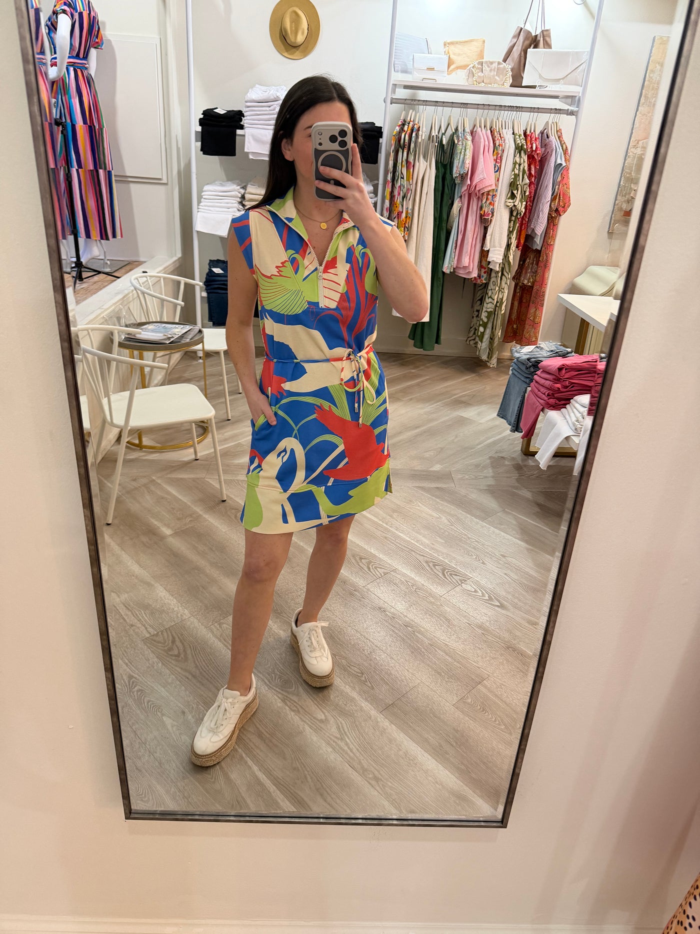 I don't know about you guys, but we can't get enough of our Leigh Dress! The Leigh is back in our print, Royal Arcadia! With the french terry fabric, tie waist, and zipper v-neck feature, you'll be the comfiest (and of course, cutest) in the room!
